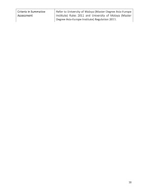 Criteria in Summative Refer to University of Malaya (Master Degree Asia-Europe Assessment Institute) Rules 2011 and University of Malaya (Master Degree Asia-Europe Institute) Regulation 2011. 30