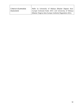 Criteria in Summative Refer to University of Malaya (Master Degree Asia- Assessment Europe Institute) Rules 2011 and University of Malaya (Master Degree Asia-Europe Institute) Regulation 2011. 56