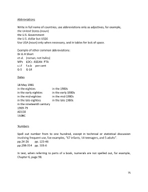 Write in full name of countries; use abbreviations only as adjectives, for example,
