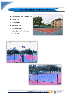 40 FSSE RESEARCH PROGRAMME HANDBOOK 2025/2026 ACADEMIC SESSION OUTDOOR MULTIPURPOSE COURT • Sports Centre Multi Purpose Court • Varsity Court • Tennis Court • Basketball Court • Wall Tennis Court • Futsal Court -2 Unit (KL Gate) • Floorball Court 40