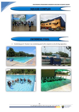 43 FSSE RESEARCH PROGRAMME HANDBOOK 2025/2026 ACADEMIC SESSION SQUASH COMPLEX SWIMMING POOL • Swimming pool- Olympic size swimming pool with complete scuba diving apparatus. 43