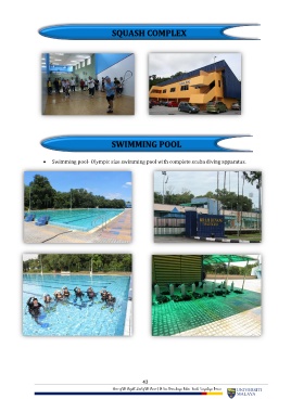 SQUASH COMPLEX SWIMMING POOL • Swimming pool- Olympic size swimming pool with complete scuba diving apparatus. 43
